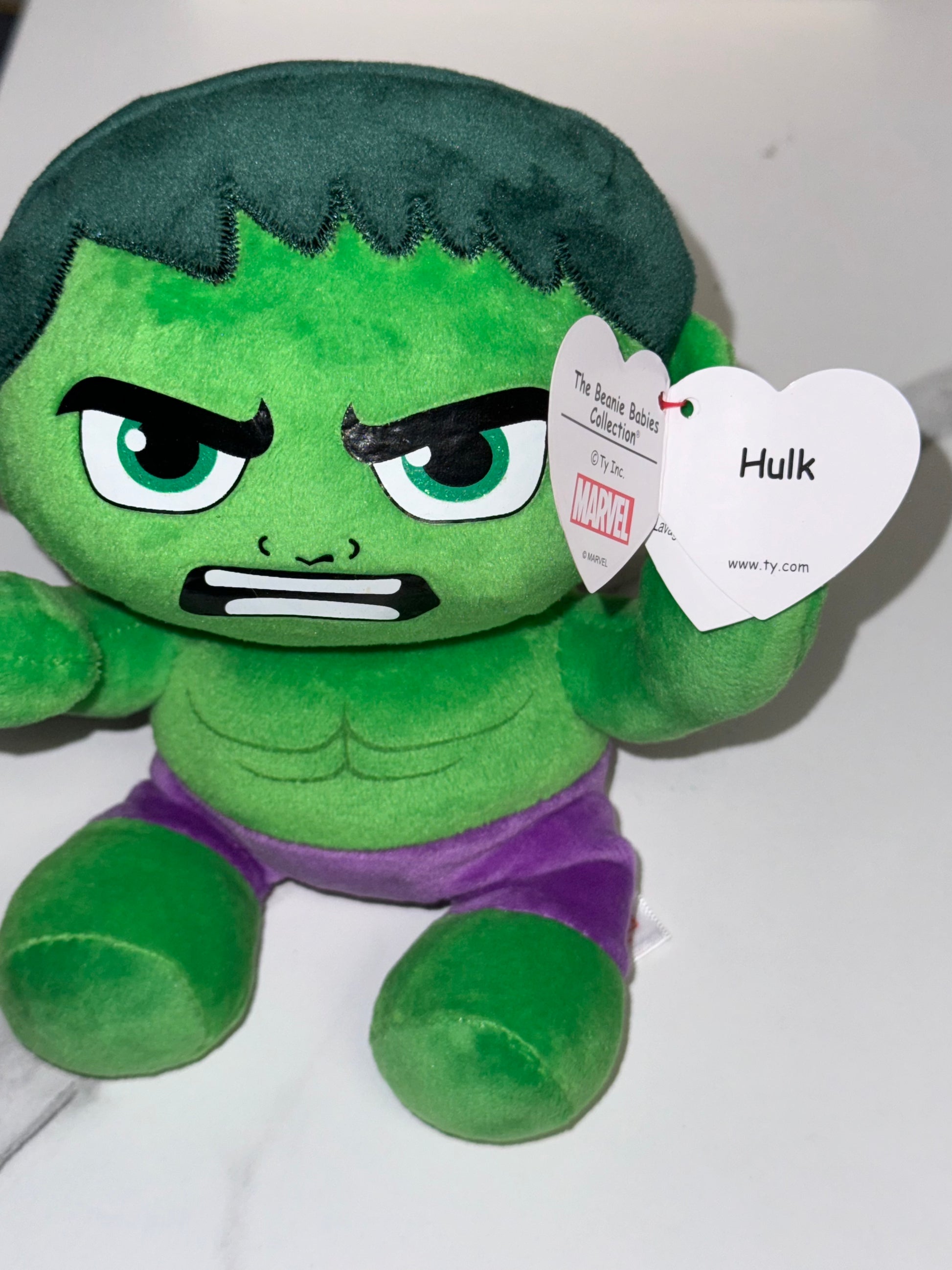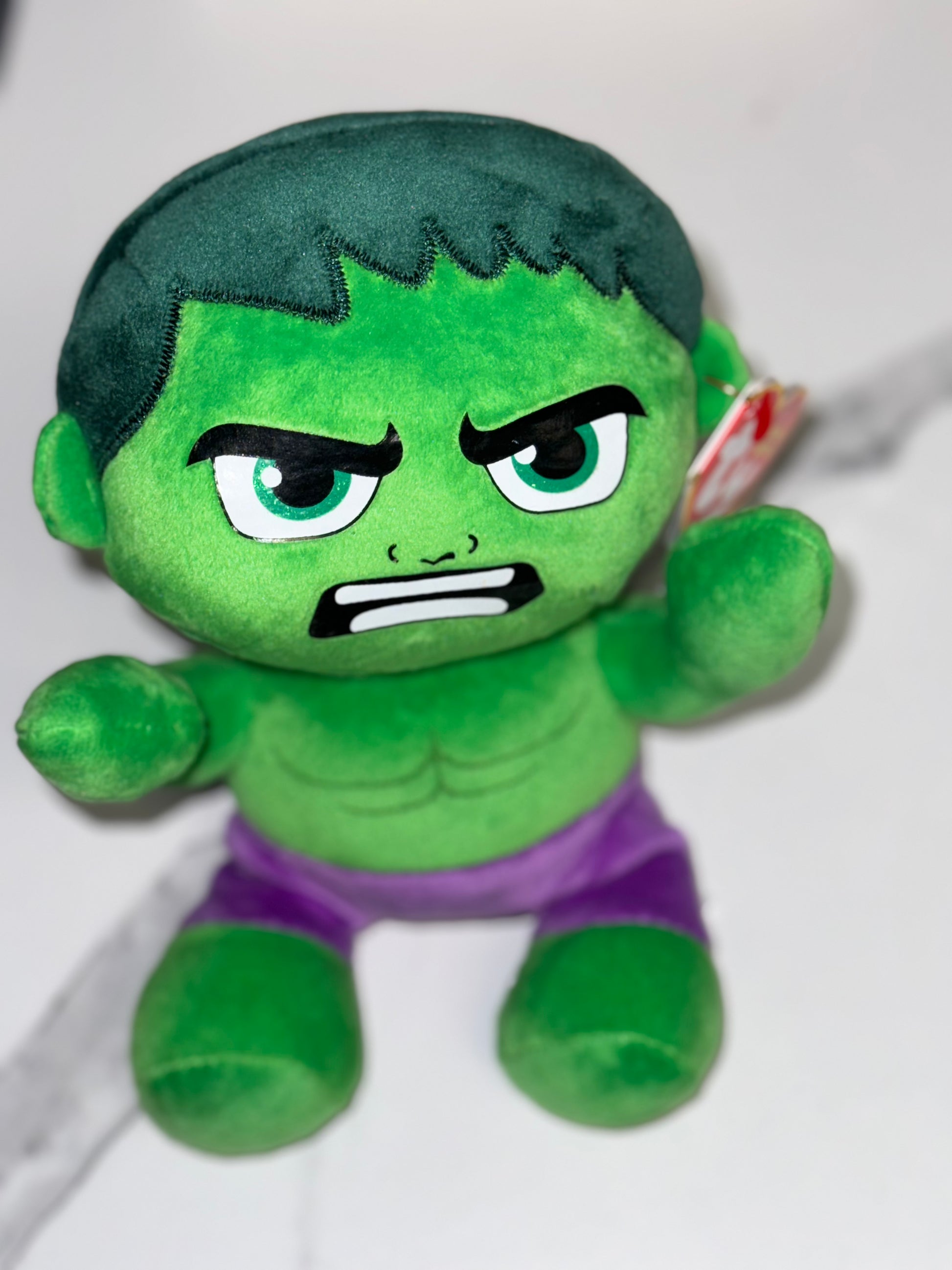 "Get ready to smash into fun with TY Beanie Babies HULK! This green monster may be small, but he packs a punch with his soft and cuddly design. Perfect for any Marvel fan, this collectible toy is sure to be a hit."
